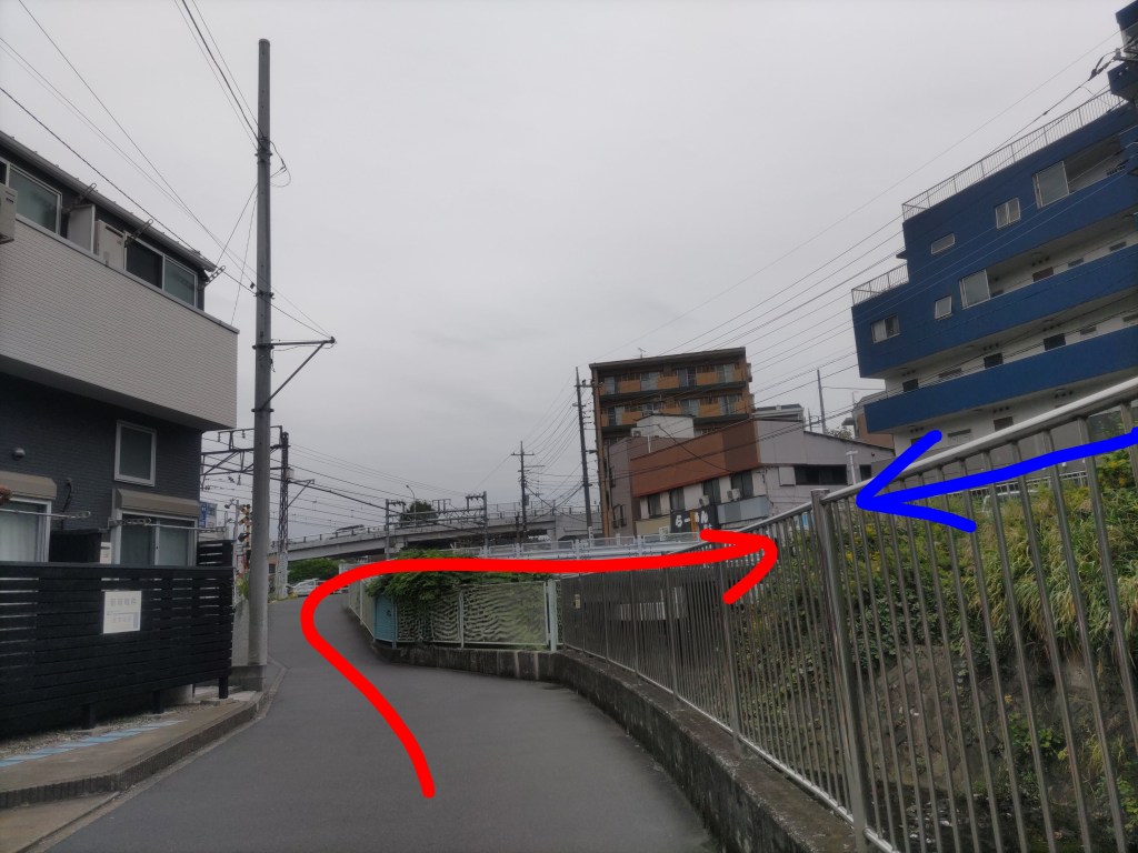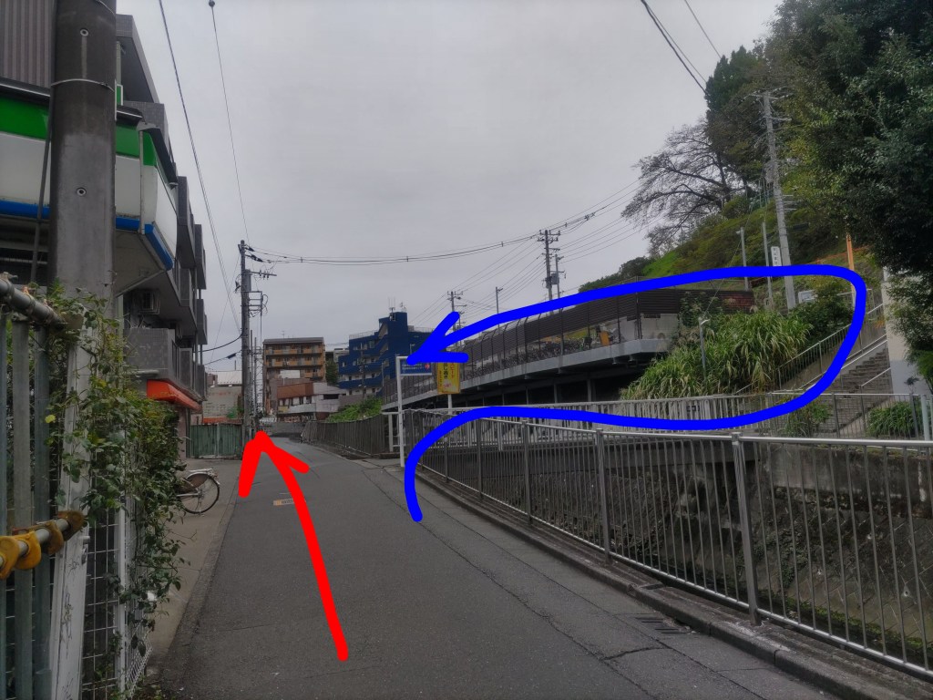 ファミリーマートの前に1本目の橋がありますが、これは通り過ぎます(赤矢印)。橋を渡っても合流できます(青矢印)が、階段があります。
