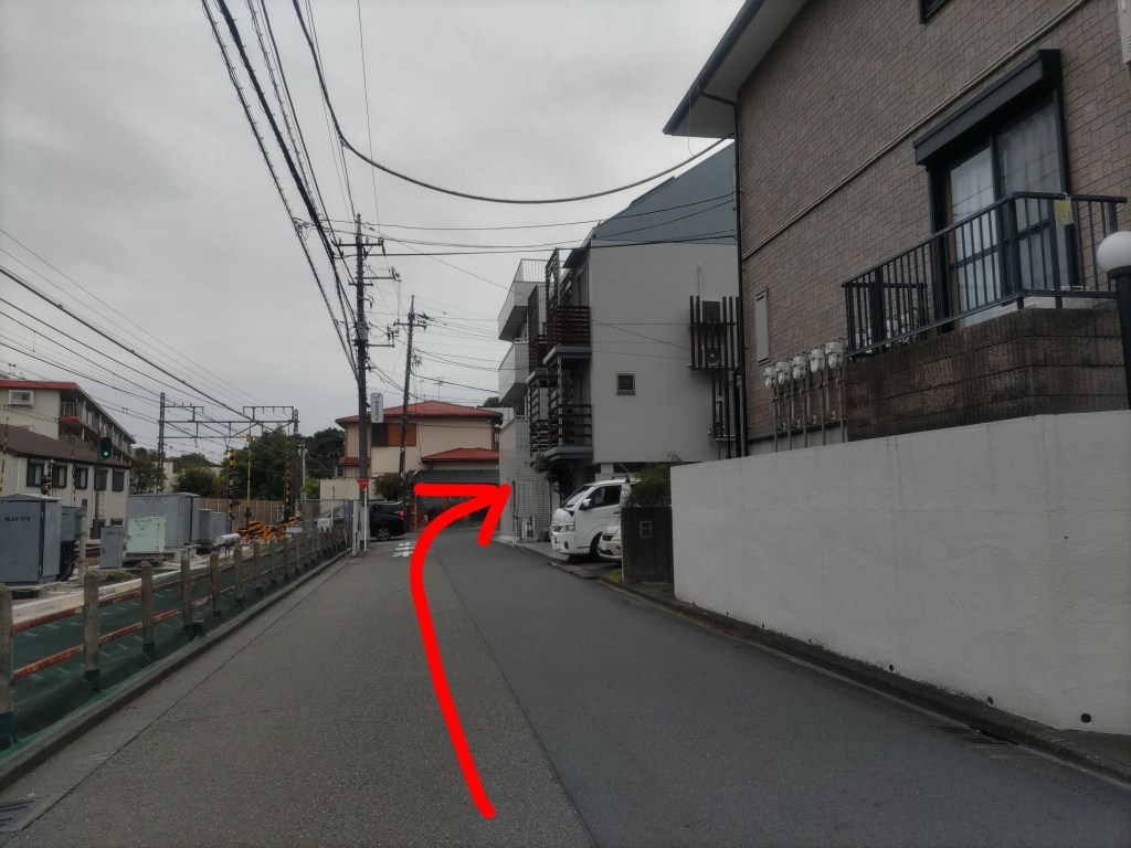 突き当たり、踏切があるところを右に曲がります。
