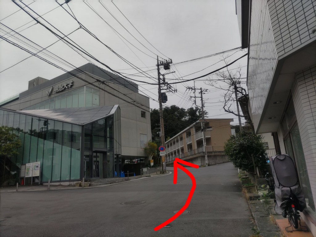 明治大学の建物の右側の坂道に入ります。ここからゆるやかな坂道が続きます。うねっていますが分岐はないので、道なりに、ちょっと不安になるくらいそのまま進んでください。ただし、左に青い門が出てきたら行き過ぎです。