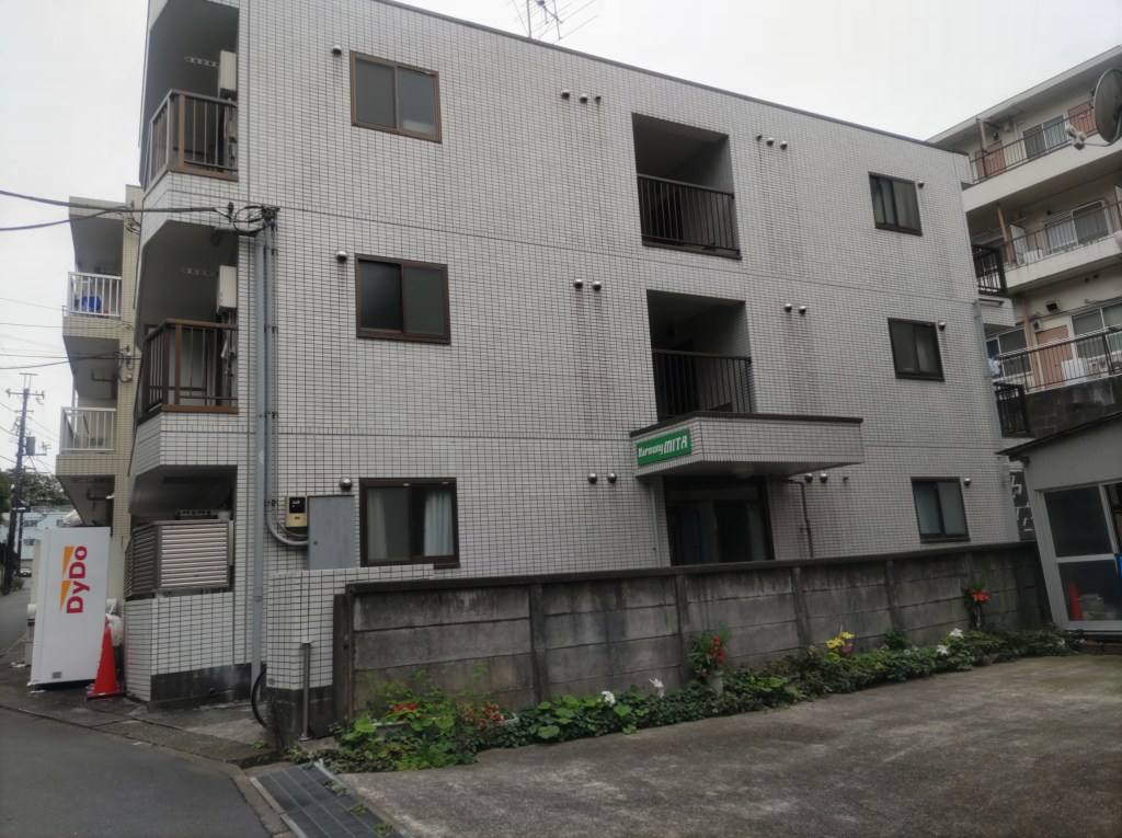 画像奥に見える白い建物が事務所が入っているアパートです
