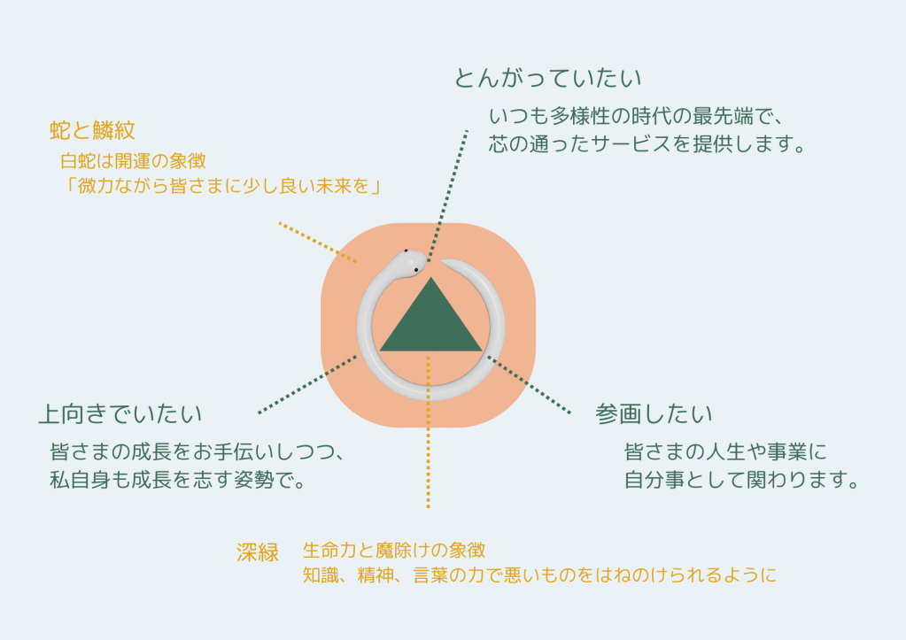 ウロコの三角形の3つの頂点には、三角形にちなんで小蛇事務所が目指したい3つの姿を込めました。